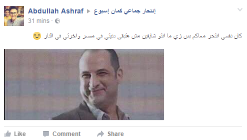اليوم ده هننبسط فيه كلنا .. طريقة الانتحار متاحة اختيارية مش هنغصب عليك وهيبقى فيه منظمين لليوم هيساعدوك إن شاء الله.. واختتم:”افتكر كل الأزمات والغلى وقلة الفلوس والجنيه والبنزين وتذكرة المترو وخليهم حافز ليك، لو دول مش كفاية إفتكر ان اللمبادا بقى بجنيه ونص ومبقاش فيه أكياس كشري بجنيه .. افتكر يا أخي إنك في مصر”.