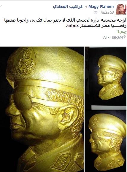 تداول رواد موقع التواصل الاجتماعي صورة لـ”لوحة مجسمة” لعبدالفتاح السيسي، نشرتها سيدة تدعى ماجي رحيم، قالت: إن “أخوها رسمها حبًا في السيسي التي اعتبرته “حبيبها”، والتي اضطرت بعد ساعة واحدة من نشرها لحذفها من صفحة يعرض فيها الأعضاء بيع ما لا يحتاجونه والتي تحمل إسم “كراكيب المعادي”.