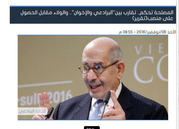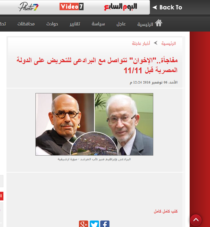 نشرت صحيفة اليوم السابع المعروف موالتها لأجهزة أمنية، خبر مفاده أن جماعة الإخوان المسلمين تتواصل مع البرادعي للتحريض على الدولة المصرية قبل 11/11.