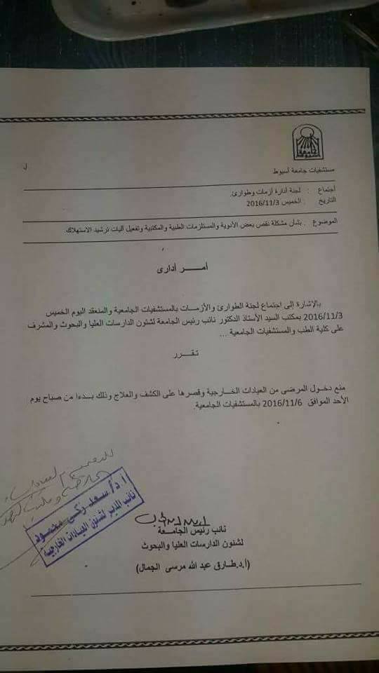 صدر أمر إدارى بالمستشفيات الجامعية بمحافظة أسيوط، والذى تقرر فيه منع دخول المرضى من العيادات الخارجية وقصرها على الكشف والعلاج والذى بدأ منذ صباح أمس الأحد بالمستشفيات الجامعية