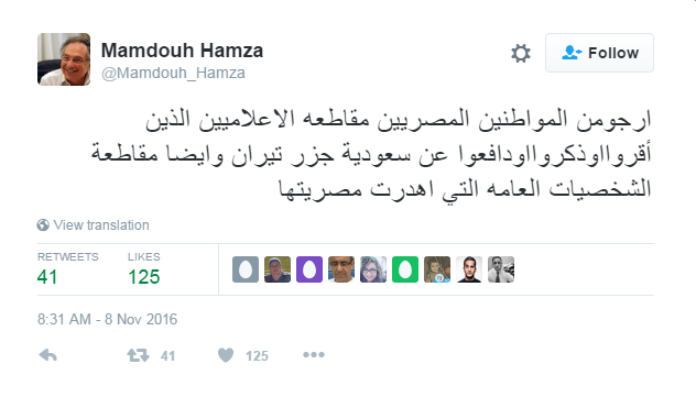 وكتب حمزة في تغريده، عبر حسابه على موقع التواصل الاجتماعى”تويتر”: “أرجو من المواطنين المصريين مقاطعة الإعلاميين الذين أقروا أو ذكروا أو دافعوا عن سعودية جزر تيران، وأيضًا مقاطعة الشخصيات العامة التي أهدرت مصريتها”.