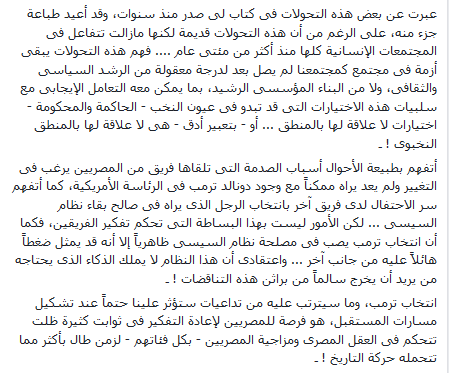 واضاف:”لم أفاجأ أو أندهش من فوز ترمب بالرئاسة الأمريكية، بل ربما كنت سأتفاجأ لو أن هيلارى كلينتون هى التى فازت، رغم كل أوراق القوة التى تمتلكها هيلارى كلينتون بالمنطق النخبوى الذى ظل هو ميزان النخبة فى المفاضلة النسبية بين المرشحين.. لم تدرك النخب – فى مصر وفى غيرها – أننا نعيش عصراً لا تحكمه معايير التفكير النخبوى، وإنما معايير تفكير عامة الناس ومن والاهم، وأن أقصى ما يمكن للنخب أن تشارك به هو إضافة بعض لمسات من الحكمة لاختيارات الجماهير التى صار لها عقل جمعى يحركها تتسع تدريجياً الفجوة التى تفصل بينه وبين العقل النخبوى، أو العقول النخبوية”