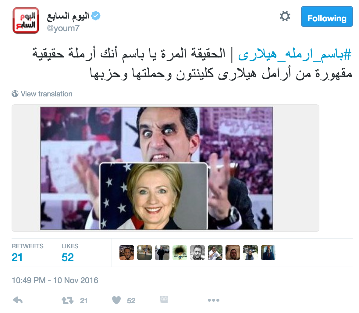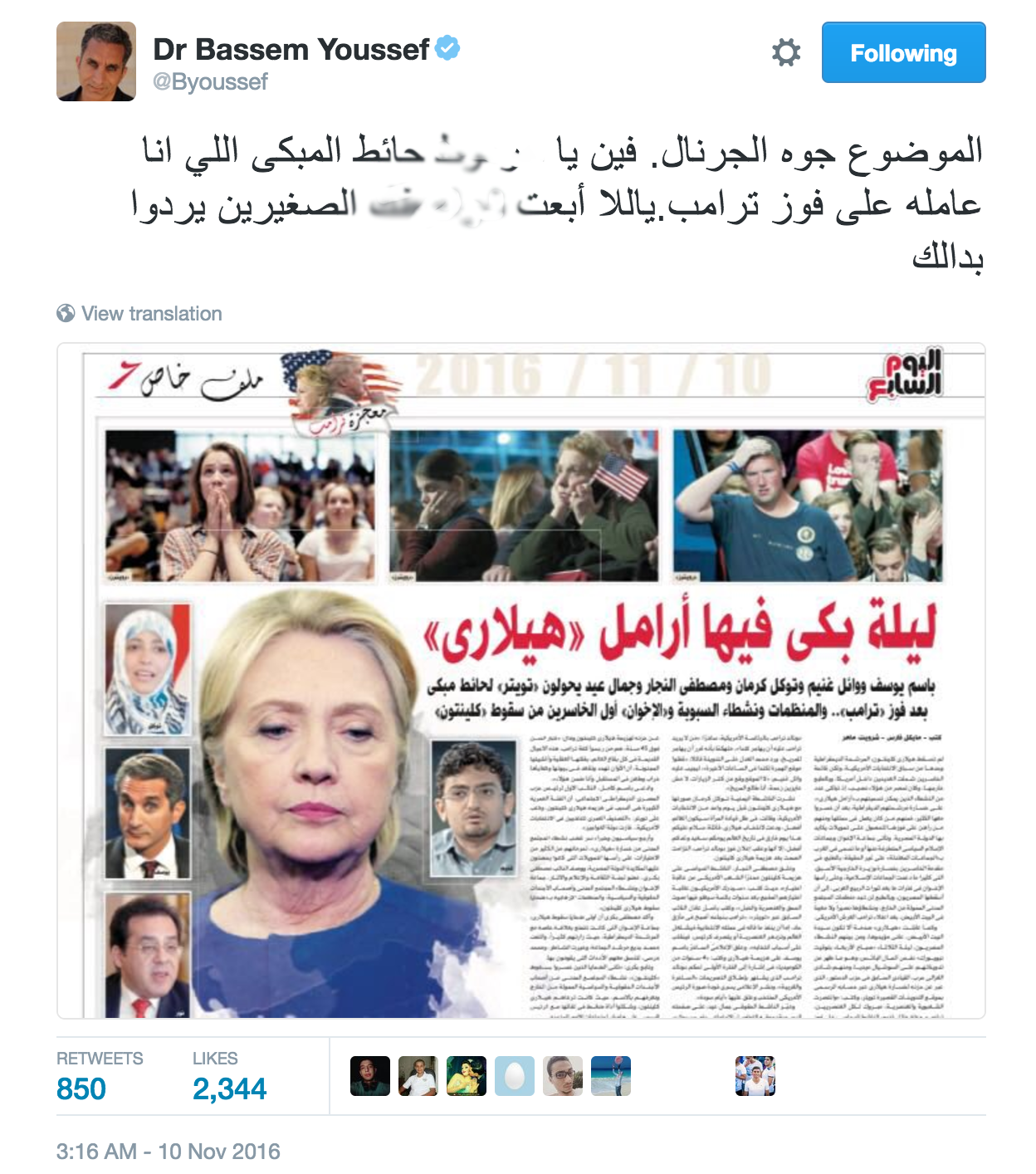 وأبرز المتفاعلين على الهاشتاج الإعلامي الساخر باسم يوسف، والذي كان من أوائل من أعلنوا استيائهم من خالد صلاح بالأمس، بعدما نشرت جريدة اليوم السابع تقريرًا عنونت فيه: ” باسم يوسف، ووائل غنيم، وتوكل كرمان، ومصطفى النجار، وجمال عيد يحولون تويتر لحائط مبكى بعد فوز ترامب”.
