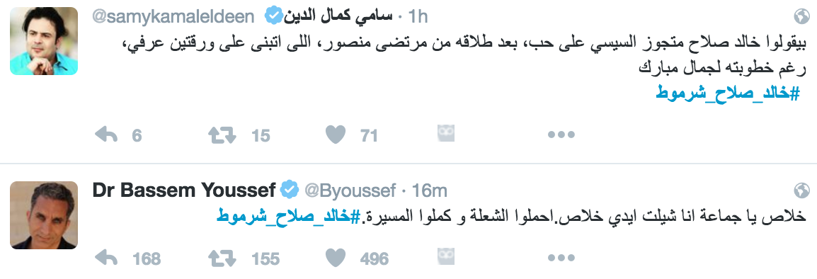 كما تداول نشطاء رد خالد صلاح في وقت سابق على باسم يوسف واصفًا إياه بأنه ملهم، لكن الخلاف الذي اشتد الآن جعل من باسم يوسف عميلًا لكلنتون على حد وصف جريدة اليوم السابع وخالد صلاح.