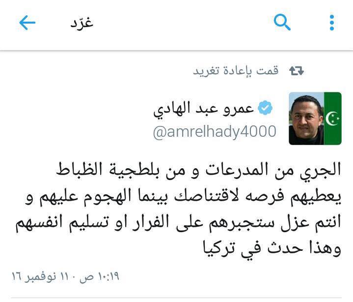 وقال عبد الهادي في تغريدته “الجري من المدرعات و من بلطجية الظباط يعطيهم فرصه لاقتناصك بينما الهجوم عليهم و انتم عزل ستجبرهم على الفرار او تسليم انفسهم وهذا حدث في تركيا”.