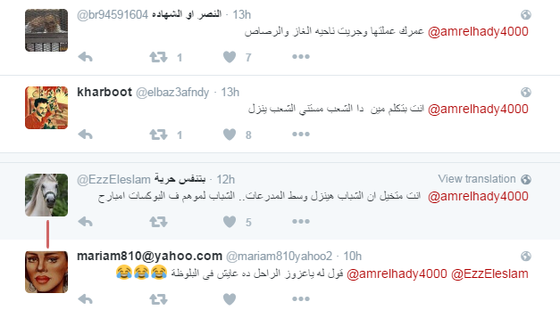 أثارت تغريدة الناشط السياسي عمرو عبد الهادي والمقيم في قطر، التي دعا من خلالها الثوار للهجوم على مدرعات قوات الأمن وعدم الهروب منها استهجان العديد من رواد موقعي التواصل الاجتماعي “فيس بوك” و”تويتر”، حيث اعتبروها دعوة للانتحار بينما هو يعيش خارج مصر.
