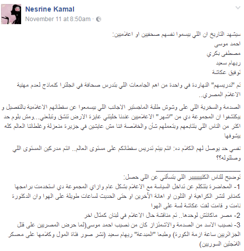 وقالت نسرين في منشور لها على موقع التواصل الاجتماعي “فيس بوك”: “سيشهد التاريخ أن اللي بيسموا نفسهم صحفيين أو إعلاميين، “أحمد موسى، مصطفى بكري، ريهام سعيد، توفيق عكاشة” تم تدريسهم في واحدة من أهم الجامعات اللي بتدرس صحافة في انجلترا كنماذج لعدم مهنية الاعلام المصري”