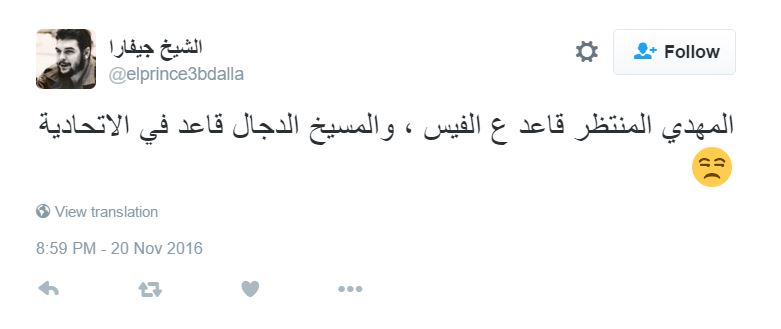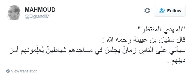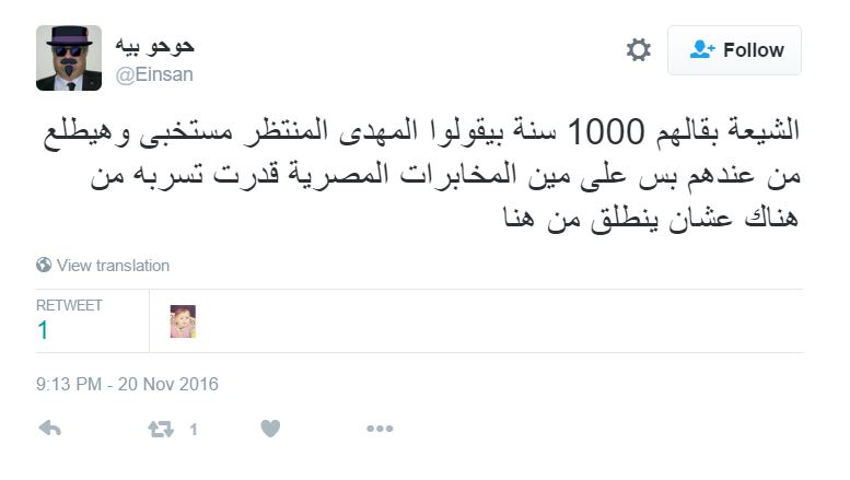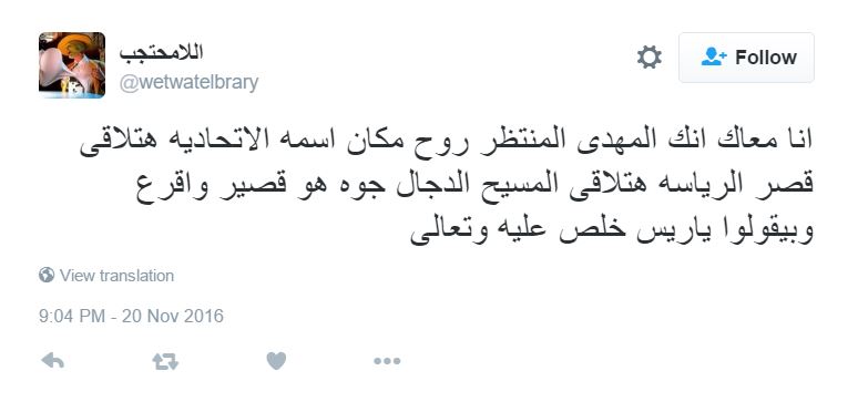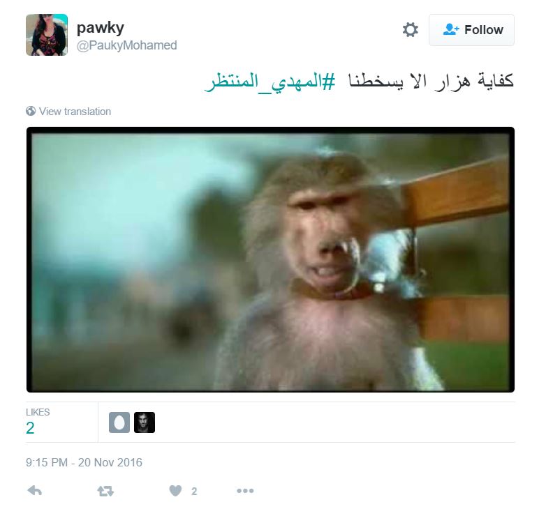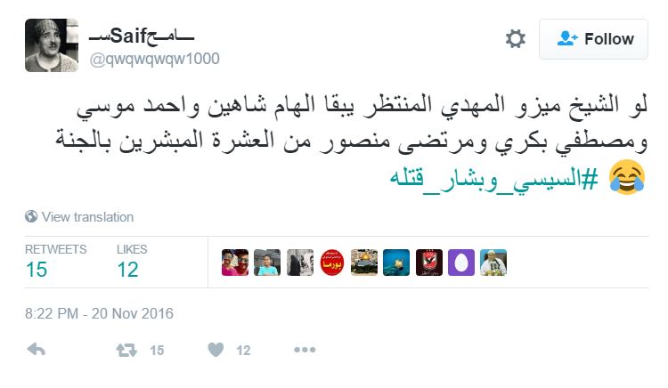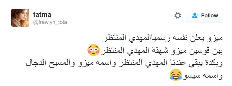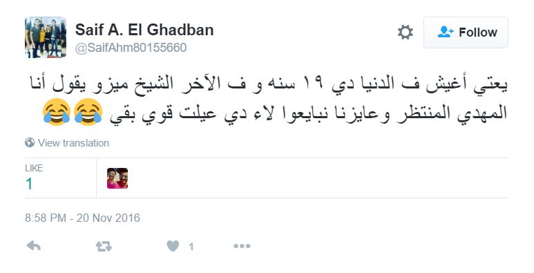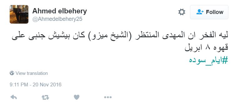 ودشن رواد موقع التدوينات الصغيرة “تويتر” هاشتاج يحمل اسم “المهدي المنتظر”، سخروا فيه من ادعاء “الشيخ ميزو”، حيث قال أحد المغردين في تدوينته : “ليه الفخر ان المهدي المنتظر (الشيخ ميزو) كان بيشيش جنبي على قهوه ٨ ابريل “.