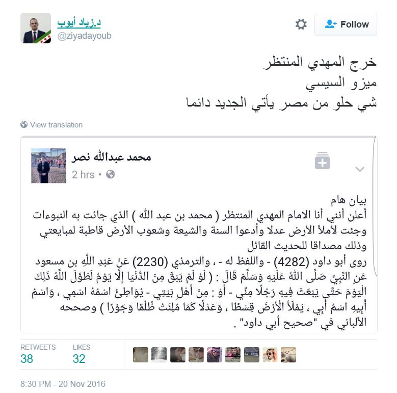 أثار بيان محمد عبدالله نصر الشهير بـ”الشيخ ميزو”، أنه هو “المهدي المنتظر”، سخرية مواقع التواصل الاجتماعي، بعد ما  استشهد بحديث عن الرسول صلى الله عليه وسلم، ومطالبًا السنة والشيعة وشعوب الأرض بمبايعته.