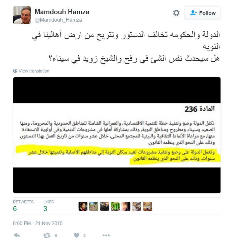 استنكر الناشط السياسيممدوح حمزة، محاولة ضم أراضي النوبة، لمشروع المليون ونصف فدان، وعرضهم للمزاد، متهمًا الدولة بالتربح من الأراضي بما يخالف الدستور.