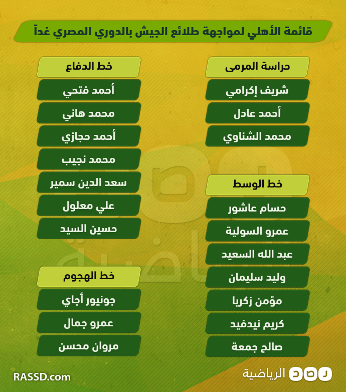 استقر حسام البدري المدير الفني لفريق الأهلي، على قائمة فريقه التي تخوض مواجهة الجيش، غدًا الأربعاء، ضمن الجولة العاشرة في الدوري الممتاز.