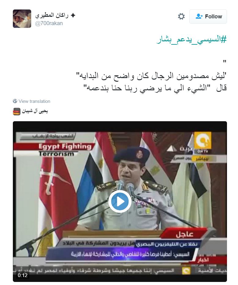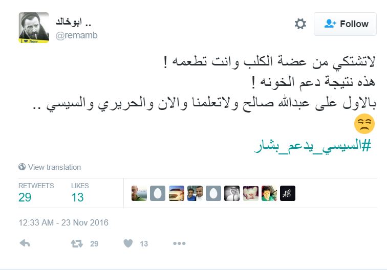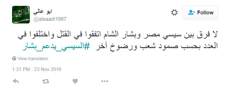 ودشن النشطاء على موقع التدوينات الصغيرة تويتر، هاشتاج باسم “السيسي يدعم بشار”، أعلنوا من خلاله رفضهم المشاركة في قتل السوريين عن طريق دعم عبد الفتاح السيسي.