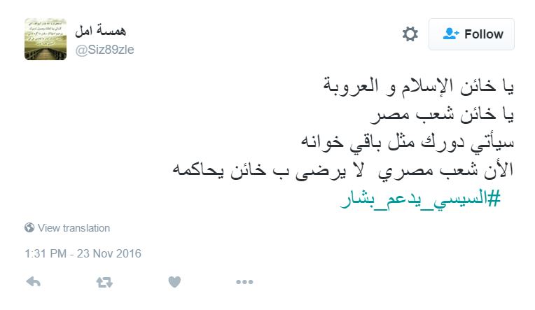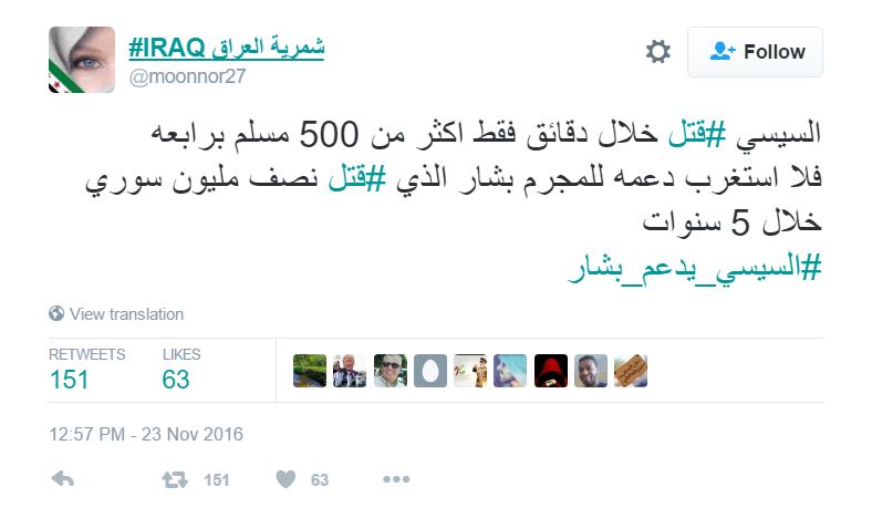 وغردت الناشطة شمرية العراق في تدوينة لها قائلة “السيسي #قتل خلال دقائق فقط اكثر من 500 مسلم برابعه فلا استغرب دعمه للمجرم بشار الذي #قتل نصف مليون سوري خلال 5 سنوات”.