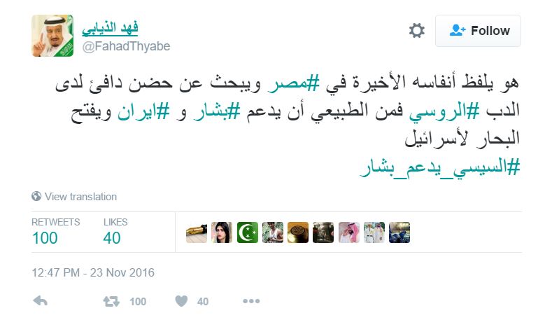 وعلق فهد الذيابي في تدوينته، مؤكداً “هو يلفظ أنفاسه الأخيرة في #مصر ويبحث عن حضن دافئ لدى الدب #الروسي فمن الطبيعي أن يدعم #بشار و #ايران ويفتح البحار لأسرائيل”.