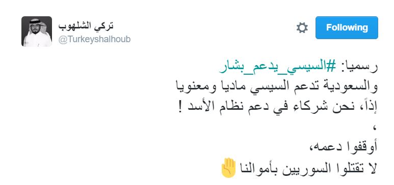 وقال الكاتب السعودي خالد العلكمي في تدوينة على صفحته الشخصية “السيسي يدعم جيش بشار بكل وضوح.. الماسك مع حبايبنا شبيحة السيسي”.
