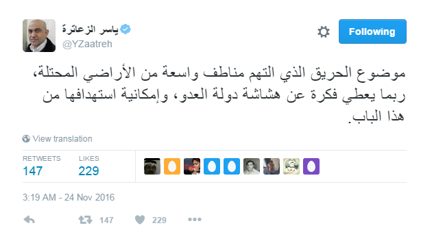 وقال الزعاترة في تدوينه له على موقع التدوين العالمي “تويتر”: “النيران التي تتشعل في مناطق شتى من الأراضي المحتلة التي يسيطر عليها الاحتلال خبر جيد، لجهة العجز الذي أبدته الدولة الصهيونية حيالها”.