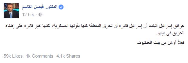 وقال القاسم في تدوينة له على صفحته الشخصية في موقع “فيس بوك”، ” حرائق إسرائيل أثبتت أن إسرائيل قادرة أن تحرق المنطقة كلها بقوتها العسكرية، لكنها غير قادرة على إطفاء الحريق في بيتها.. فعلاً أوهن من بيت العنكبوت”.