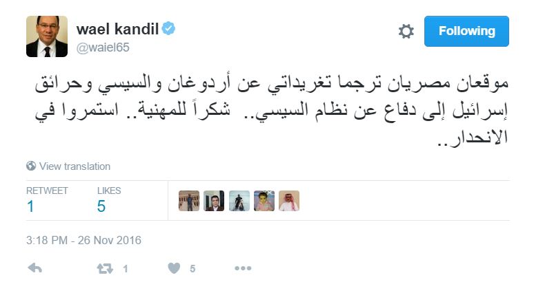 وأضاف في تغريدة أخرى، ” موقعان مصريان ترجما تغريداتي عن أردوغان والسيسي وحرائق إسرائيل إلى دفاع عن نظام السيسي.. شكراً للمهنية.. استمروا في الانحدار”.