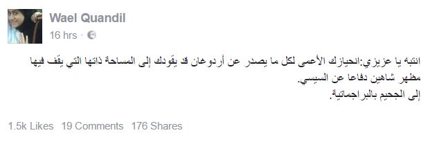 وكان قنديل قد انتقد في عدة تغريدات، مساندة تركيا، دولة الاحتلال في إطفاء الحرائق التي اندلعت بها، وقال في منشور له في موقع “فيس بوك”، “انتبه يا عزيزي:انحيازك الأعمى لكل ما يصدر عن أردوغان قد يقودك إلى المساحة ذاتها التي يقف فيها مظهر شاهين دفاعا عن السيسي”.