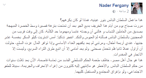 واضاف فرجاني ، عبر منشور له علي صفحته الشخصية “فيس بوك” :” مررت صباح يوم من أيام هذا الخريف بديع الجو بعد أن تمتعت بنزهة قصيرة وسط الخضرة المبهجة بصديق من العاملين الشباب و هالني أن وجدته عابسا ومهموما حد الكآبة، كان إلى وقت قريب من المعجبين بالسلطان البائس فسألته لمَ العبوس والنكد.”