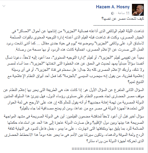 وقال عبر منشور له علي صفحته الشخصية “فيس بوك” :” شاهدت الليلة الفيلم الوثائقى الذى أذاعته فضائية “الجزيرة” من إنتاجها عن أحوال “العساكر” فى الجيش المصرى، وكنت قد شاهدت قبله الفيلم الذى أعدته إدارة التوجيه المعنوى بالقوات المسلحة لاستباق الرد على وثائقى “الجزيرة” وموضوعه “يوم فى حياة جندى مقاتل … كما أننى تابعت ردود الفعل التى صدرت عن الإعلام المصرى، انفعالية كانت هذه الردود أو بها مسحة من رصانة.”