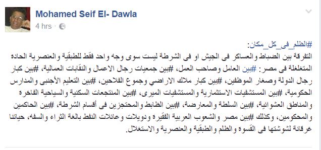 وقال سيف الدولة في منشور له على صفحته في موقع “فيس بوك”، إن “العنصرية الحادة المتغلغلة فى مصر: بين العامل وصاحب العمل، بين جمعيات رجال الأعمال والنقابات العمالية، بين كبار رجال الدولة وصغار الموظفين، بين كبار ملاك الأراضي وجموع الفلاحين، بين التعليم الأجنبي والمدارس الحكومية، بين المستشفيات الاستثمارية والمستشفيات الميرى، بين المنتجعات السكنية والسياحية الفاخرة والمناطق العشوائية، بين السلطة والمعارضة، بين الظابط والمحتجزين فى أقسام الشرطة، بين الحاكمين والمحكومين، وكذلك بين مصر والشعوب العربية الفقيرة ودويلات وعائلات النفط بالغة الثراء والسفه”.