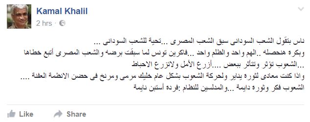 كتب الناشط اليساري كمال خليل، منشورًا، يعلق فيه عن الأحداث في السودان، بعد يومين من الإضراب، والمطالبة بالتمديد ليوم ثالث، مطالبًا بنشر أخبارهم، واصفًا السودان بـ "البشارة والإشارة".