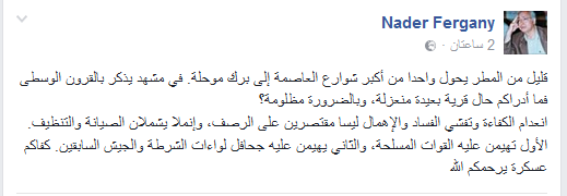 ونشر فرجاني علي صفحته الشخصية “فيس بوك”: “قليل من المطر يحول واحدًا من أكبر شوارع العاصمة إلى برك موحلة، في مشهد يذكر بالقرون الوسطى”.