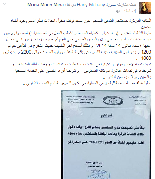 قالت “مينا”في منشور لها علي صفحتها الشخصية” فيس بوك”: “أن الأطباء المقيمين وهم شباب الأطباء المتحملين لأغلب العمل في المستشفيات أصبحوا يهربون من مستشفيات التأمين الصحي ، وذلك بسبب عدم صرف زيادة الأجور التي حصل عليها الأطباء بقانون 14 لسنة 2014”