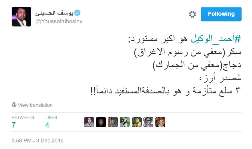 قال الحسيني عبر “تويتر”: “#أحمد_الوكيل هو اكبر مستورد: سكر(معفي من رسوم الاغراق) دجاج(معفي من الجمارك) مُصدر أرز..3 سلع متأزمة و هو بالصدفة المستفيد دائماً!!”.