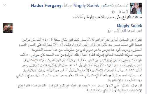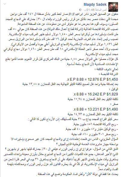 شارك “فرجاني” منشورا علي صفحته الشخصية “فيس بوك” للخبير السياحي مجدي صادق ،قال فيه :”صار لغط كبير بشأن صفقة الـ ١٤٧ ألف طن دواجن مجمدة التي دخلت مصر بعد دقائق من قرار رئيس الوزراء بإلغاء ٣٠٪ جمارك علي الدجاج المجمد المستورد وسوف أقوم هنا بعرض ما هو متوفر لدي من معلومات عن هذه الصفقة المشبوهة.