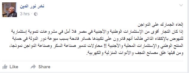 وقال نور الدين في منشور له عبر صفحته على “فيس بوك”، “إذا كان التجار أقوى من الاستثمارات الوطنية والأجنبية في مصر، فلا أمل في مشروعات تنموية إستثمارية للنهوض بالإكتفاء الذاتي طالما أنهم قادرون على تكبيدها خسائر فادحة بسبب ميوعة دور الدولة في حماية المنتج الوطني والاستثمارات المحلية والأجنبية !!”.
