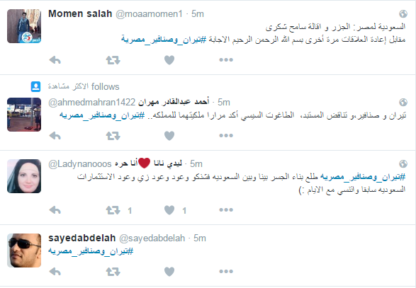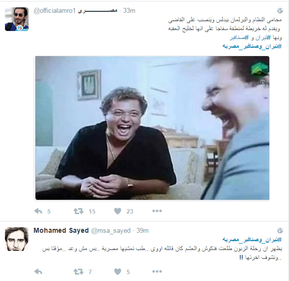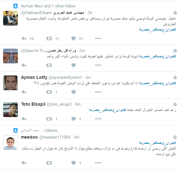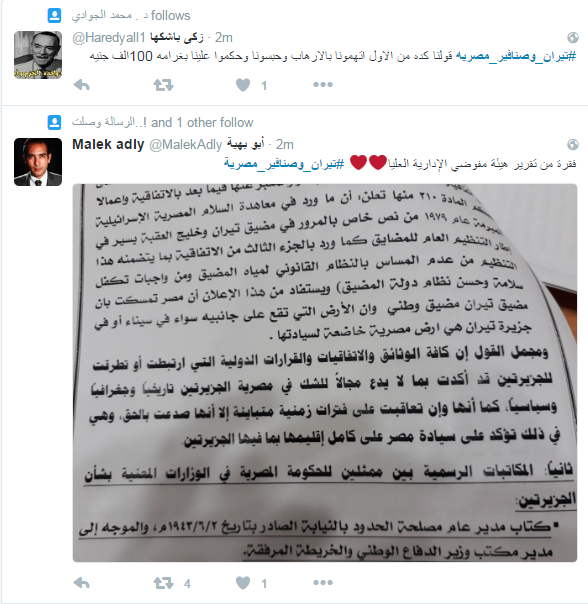 دشن نشطاء موقع التواصل الاجتماعى “تويتر” هاشتاج تحت وسم “#تيران_وصنافير_مصريه”، بعد قرار المحكمة الإدارية بتأجيل النظر في مصرية “تيران وصنافير” إلى 19 ديسمبر الجاري.