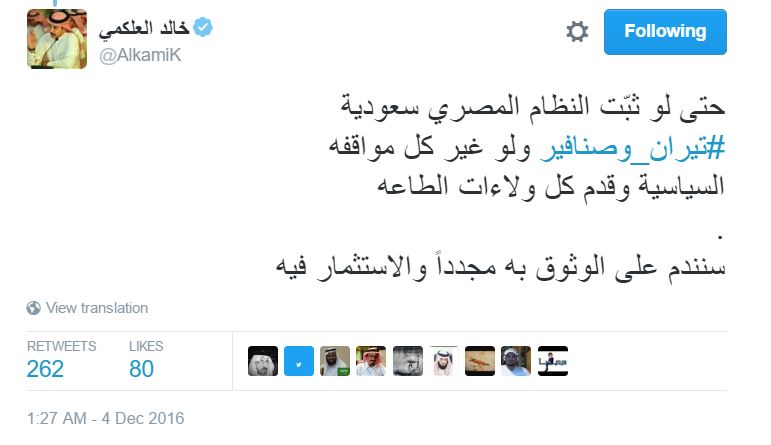 وكتب “العلكمي” في تغريدة له على صفحتة الشخصية عبر موقع التدوينات الصغيرة “تويتر”، “حتى لو ثبّت النظام المصري سعودية #تيران_وصنافير ولو غير كل مواقفه السياسية وقدم كل ولاءات الطاعه . سنندم على الوثوق به مجدداً والاستثمار فيه”.