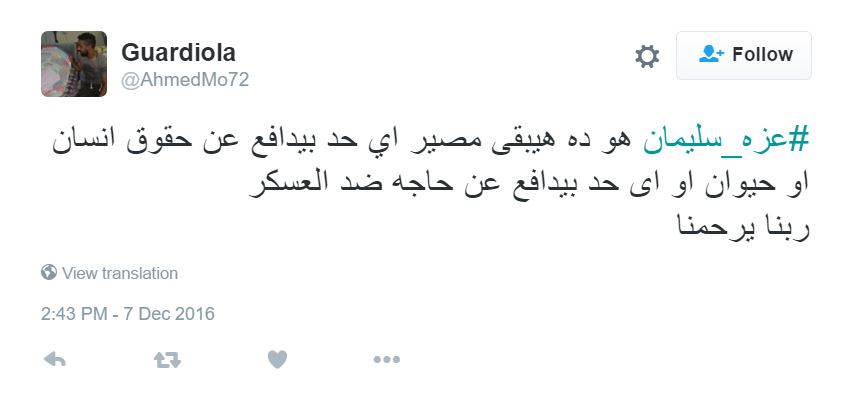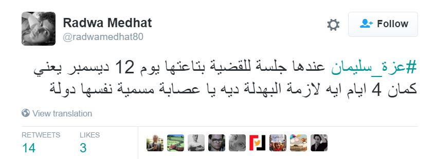 ودشن النشطاء، هاشتاجًا يحمل عنوان “عزة سليمان” للتنديد بممارسات الدولة تجاة الحقوقيين بشكل عام والمرأة بشكل خاص.