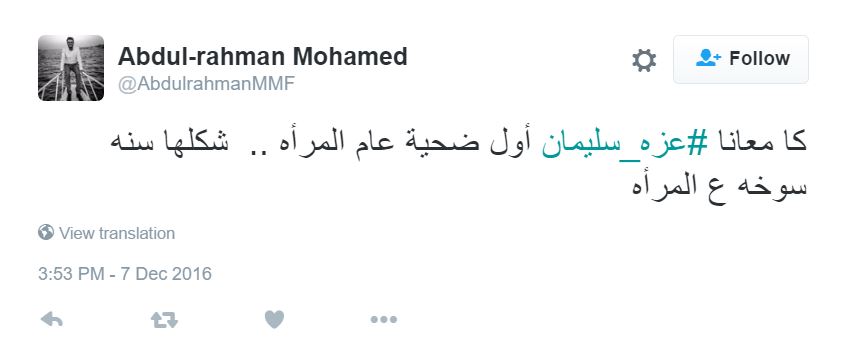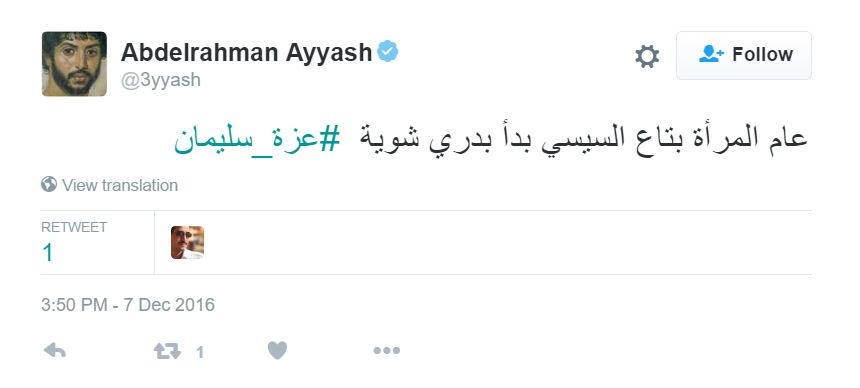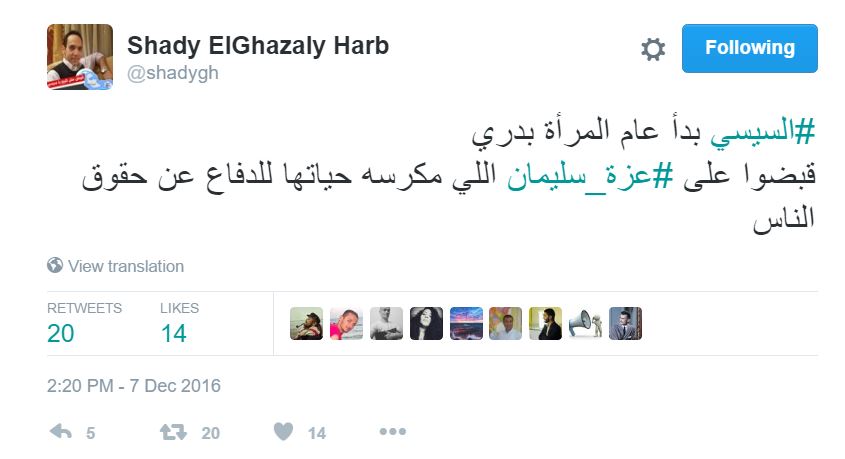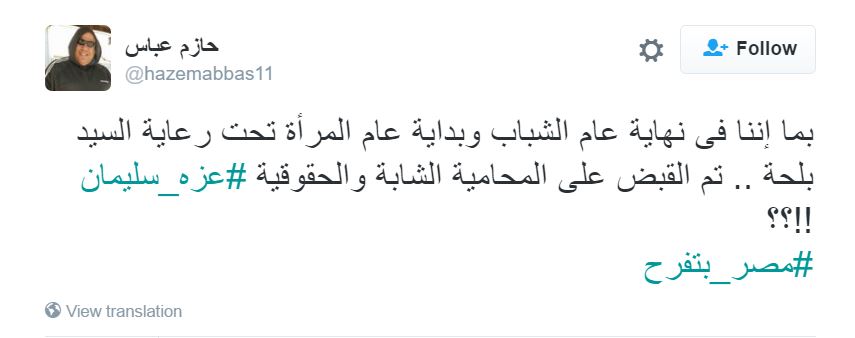 وسخر المشاركون، من تسمية عام 2017 بعام المراة، والاحتفاء به بالقبض على الناشطة، وقال أحد المغردين: “بم أننا فى نهاية عام الشباب وبداية عام المرأة تحت رعاية السيد بلحة.. تم القبض على المحامية الشابة والحقوقية #عزه_سليمان !!؟؟ “.