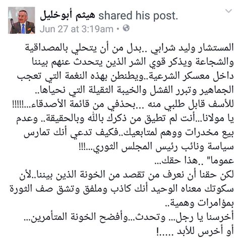 ومن جانبه، علق القيادي السابق بجماعة الإخوان إبراهيم الزعفراني، على منشور هثيم أبوخليل متسائلاً :