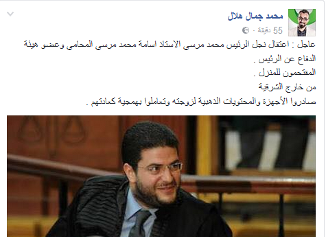 أعلنت أسرة الدكتور محمد مرسي، القبض علي نجلها والمتحدث باسم الأسرة أسامة مرسي.