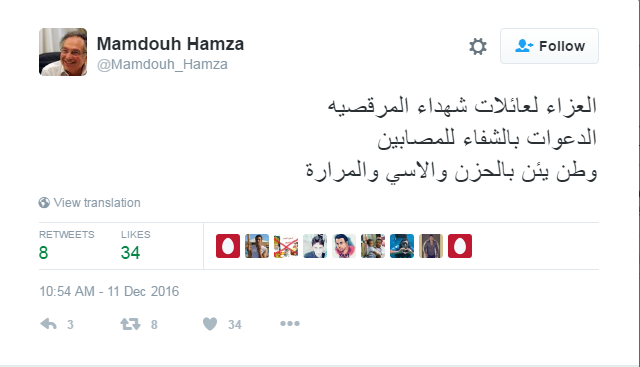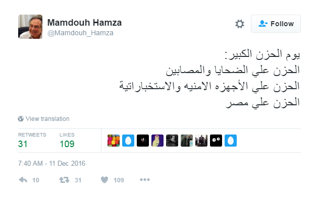 وكتب حمزة في تدوينة له عبر حسابه الشخصي على “تويتر”: يوم الحزن الكبير.. الحزن علي الضحايا والمصابين ..الحزن علي الأجهزه الأمنيه والاستخباراتية .. الحزن علي مصر”.
