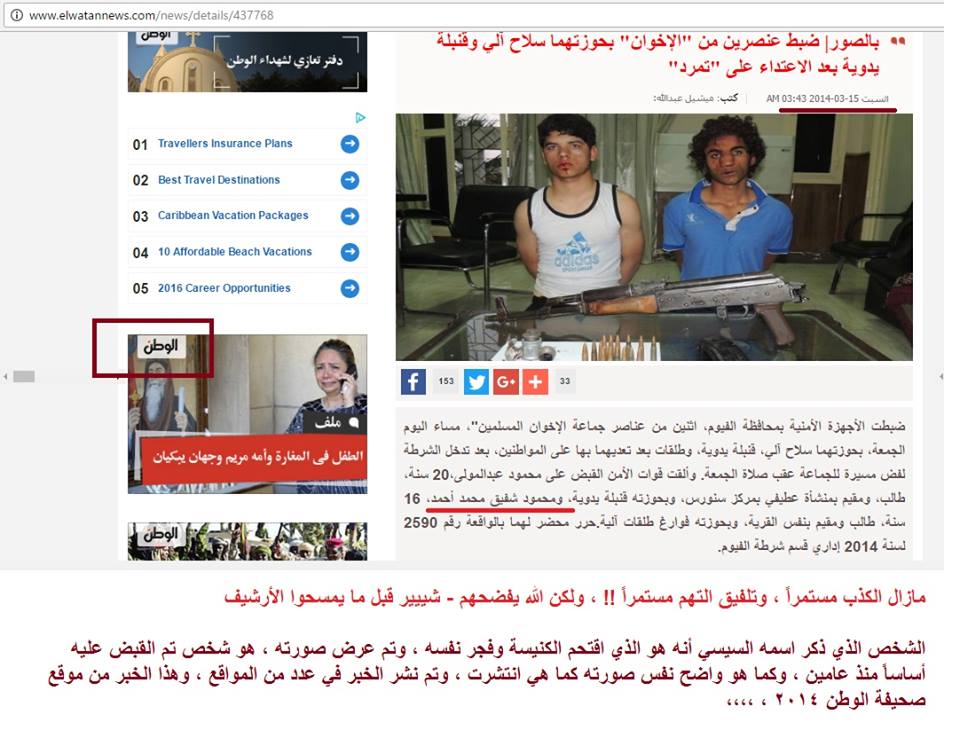 تداول نشطاء على مواقع التواصل الاجتماعي خبرًا نقلاً عن جريدة الوطن، ذكر أن الأجهزة الأمنية بالفيوم ألقت القبض على شابين بحوزتهم “سلاح آلى، قنبله يدوية، وطلقات آلى” تعدوا بها على المواطنيين أثناء قيام الشرطه بفض مسيرة للإخوان بالفيوم.