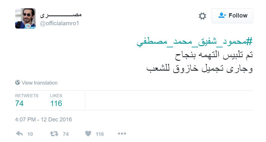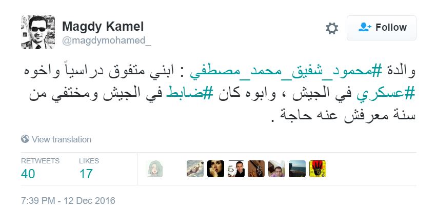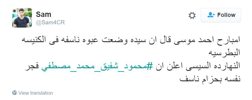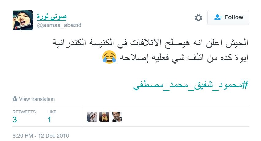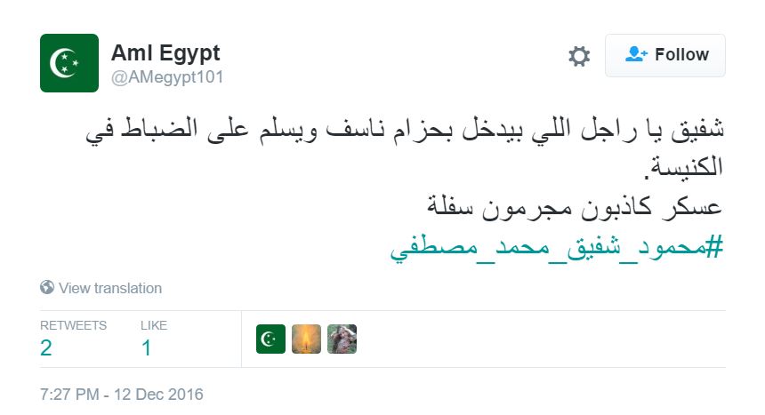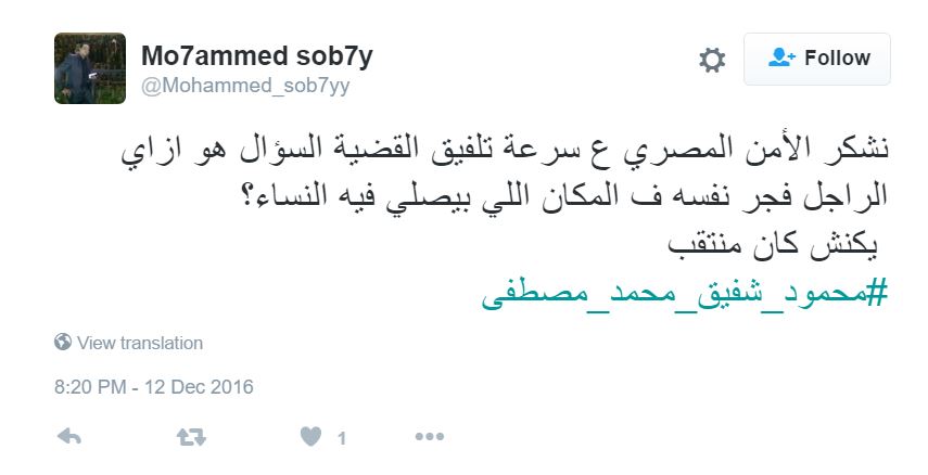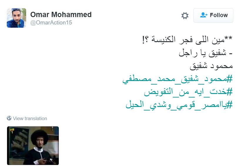 ودشن النشطاء هاشتاج باسم “#محمود_شفيق_محمد_مصطفي”، وهو الاسم الذي أُعلن على أنه الانتحاري الذي فجر نفسه داخل الكنيسة، بحسب ما ورد في رواية الداخلية.
