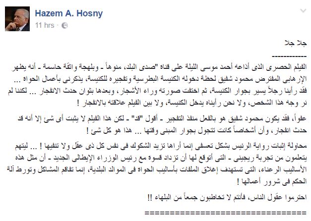 قال حسني ، في منشور له عبر صفحته الشخصية، على موقع “فيس بوك”: “الفيلم الحصرى الذى أذاعه أحمد موسى على قناة “صدى البلد، منوهاً – وبلهجة واثقة حاسمة – أنه يظهر الإرهابى المفترض محمود شفيق لحظة دخوله الكنيسة البطرسية وتفجيره للكنيسة، يذكرنى بأعمال الحواة”.