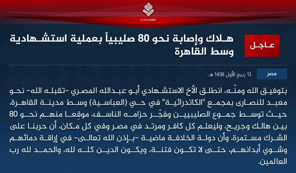 تبنّى تنظيم الدولة، اليوم الثلاثاء، التفجير الذي استهدف الكنيسة البطرسية الملحقة بالكاتدرائية، الأحد الماضي، في حي العباسية وسط القاهرة.