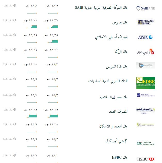 وسجل الدولار في البنك المصري الخليجي 18,2 جنيهًا للشراء، 18,65 جنيهًا للبيع، بنك كريدي أجريكول مصر سعر 18.2 جنيهًا للشراء و18.6 جنيهًا للبيع، وسجل في بنك HSBC 18,2 جنيهًا للشراء, 18,7 جنيهًا للبيع، وفي بنك مصر إيران للتنمية 18,3 جنيهًا للشراء، 18,7 جنيهًا للبيع ، بينما سجل سعر الدولار في بنك بيريوس 18٫37 جنيهًا للشراء، 18٫75 جنيهًا للبيع، البنك التجارى الدولي CIB 18,15 جنيهًا للشراء، 18٫6 جنيهًا للبيع.