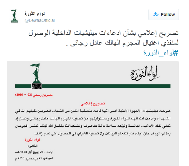 نفى “لواء الثورة” ما جاء في بيان وزارة الداخلية بشأن تصفية شخصين ينتميان للواء على علاقة باغتيال العميد عادل رجائي.