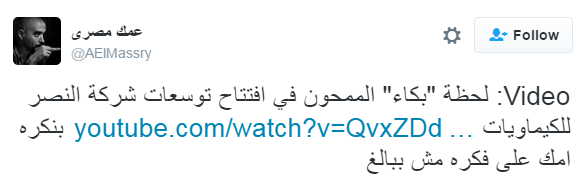 أثارت دموع عبدالفتاح السيسي خلال افتتاحه مصنع البتروكيماويات سخرية رواد مواقع التواصل الاجتماعي، حيث تعد هذة المرة السابعة منذ سيطرته على حكم مصر.