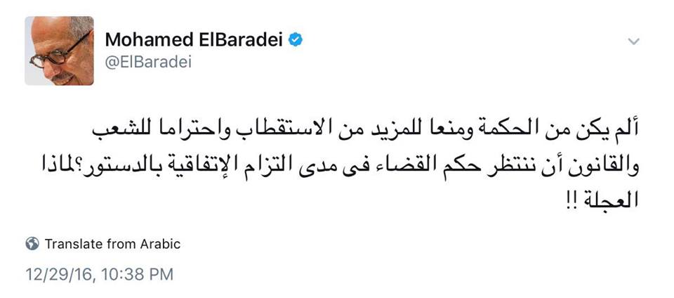 قال البرادعي في تغريدة عبر حسابه الشخصي عبر موقع التدوينات المصغر “تويتر”:” ‏ألم يكن من الحكمة ومنعا للمزيد من الاستقطاب واحتراما للشعب والقانون أن ننتظر حكم القضاء فى مدى التزام الإتفاقية بالدستور؟.. لماذا العجلة؟”