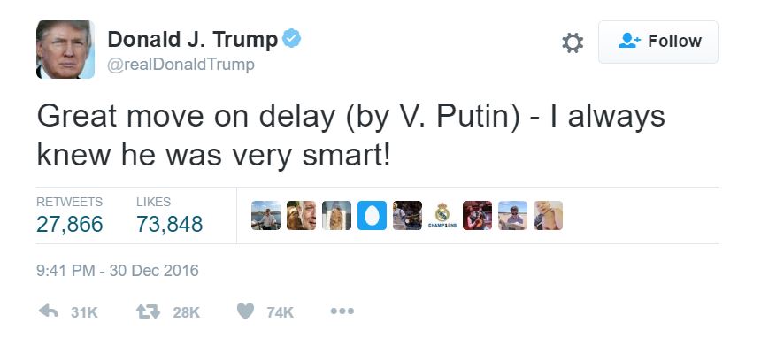 وأشاد الرئيس الاميركي المنتخب، دونالد ترامب، أمس الجمعة، بموقف الرئيس الروسي بوتين، من سلسلة العقوبات التي فرضتها إدارة أوباما على روسيا، وغرد عبر حسابه الشخصي على موقع “تويتر”، قائلا” إن تأخير الرد ، هي خطوة موفقة من بوتين، وطالما عرفت أنه يتميز بالذكاء الشديد”.