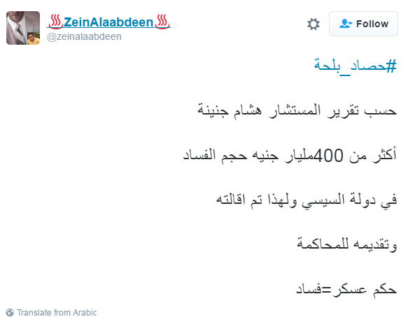قبل ساعات من نهاية عام 2016م، دشن مغردو موقع التواصل الاجتماعي "تويتر" هاشتاج "#حصاد_بلحة" في إشارة إلى عبدالفتاح السيسي، عبروا فيه عن سخطهم مما آلت إليه البلاد تحت حكمه، وما تبعها من أزمات اقتصادية كبرى لنصر، لافتين إلى أن