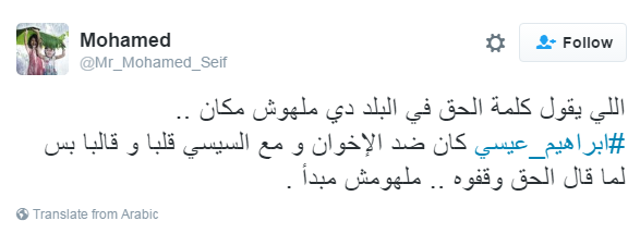 تصدر هاشتاج "#إبراهيم_عيسى" موقع التدوين العالمي "تويتر" بعد وقف برنامج "مع إبراهيم عيسى" على قناة القاهرة والناس، وهو ما أعلن عنه الإعلامي إبراهيم عيسى، في بيان له اليوم أول أيام عام 2017، ليؤكد أن حرية الصحافة والإعلام في خ